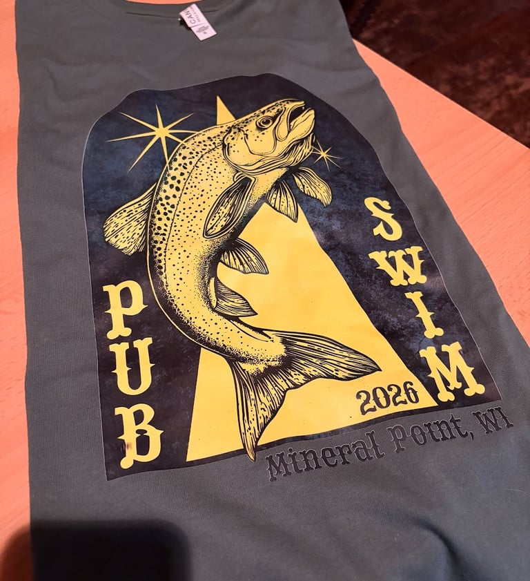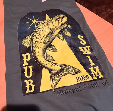 PUB SWIM official merch (shirts!) available for purchase for just $20 at Sullivan's in downtown Mineral Point.